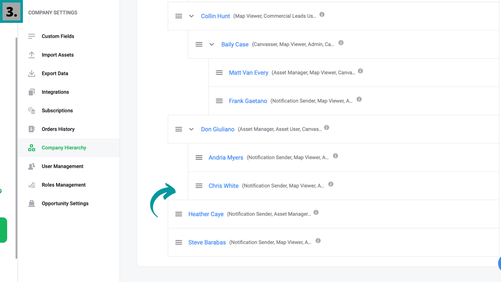 - Uso de roles preestablecidos: para configurar la jerarquía de la empresa correctamente, verifique que todos los gerentes y sus equipos tengan los roles Gerente de sondeo o Sondeador y no tengan los roles Administrador de escrutinio o Administrador de activos.