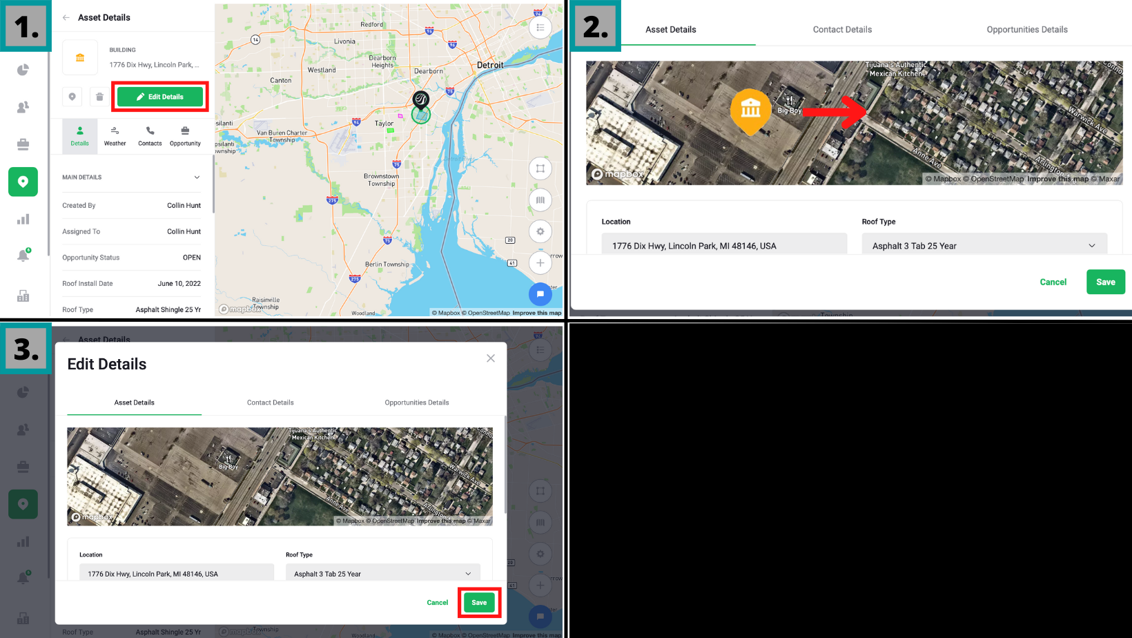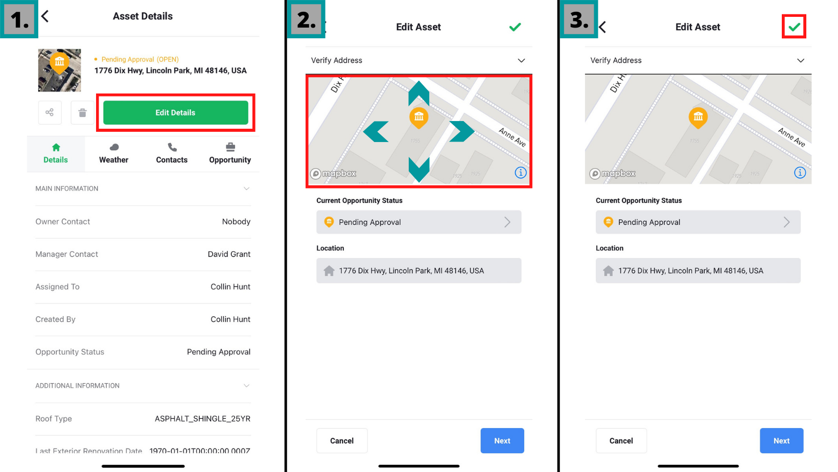 Aplicación móvil Primer paso: busque un activo que desee editar Toca Editar detalles (Edit Details) Seleccione Detalles del activo (Asset Details) en el menú desplegable y toque Tipo de techo Seleccione un tipo de la lista predeterminada Toque el ✔️ ...