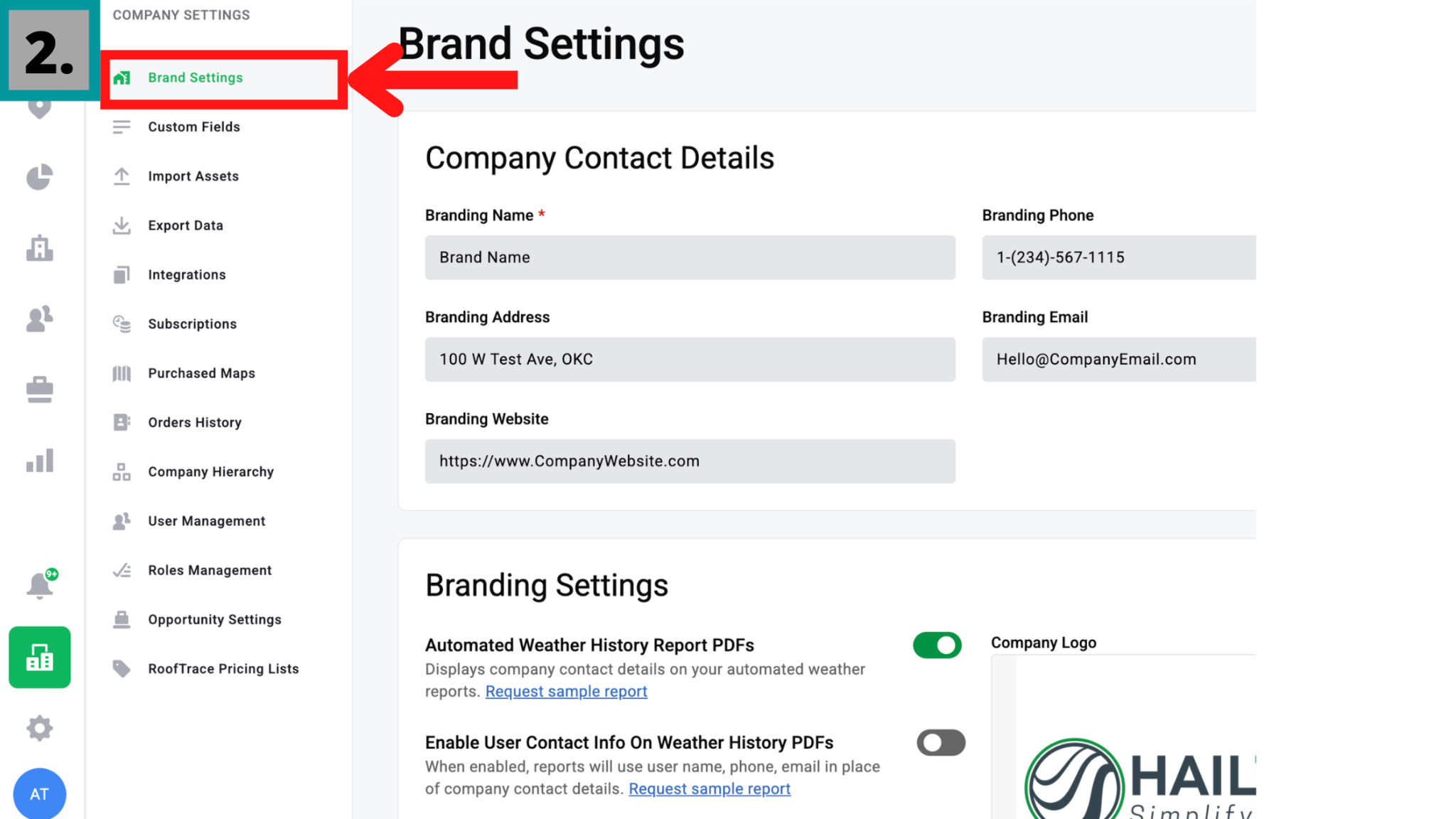 The Brand Settings tab is located under Company Settings in the HailTrace browser app.