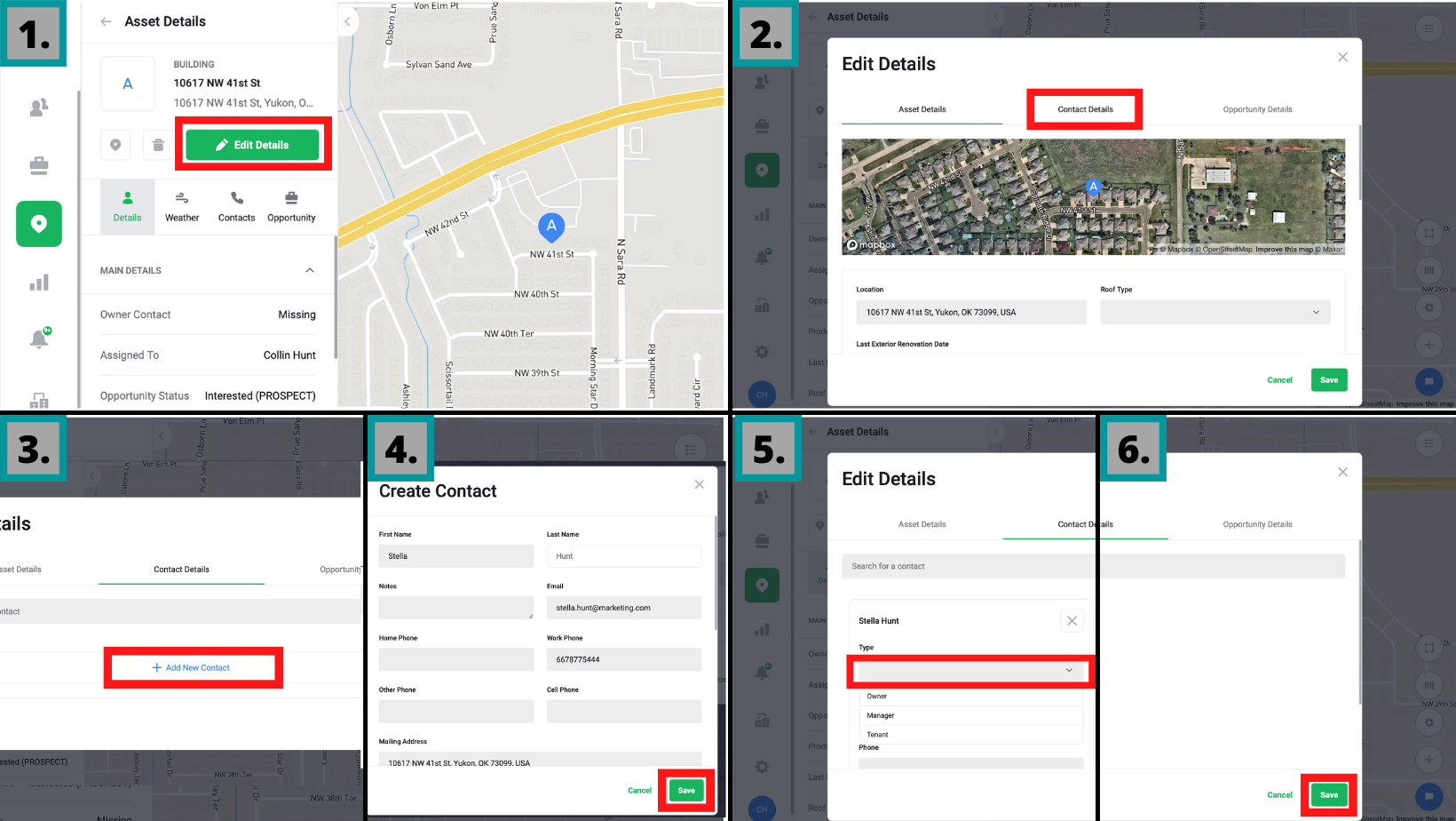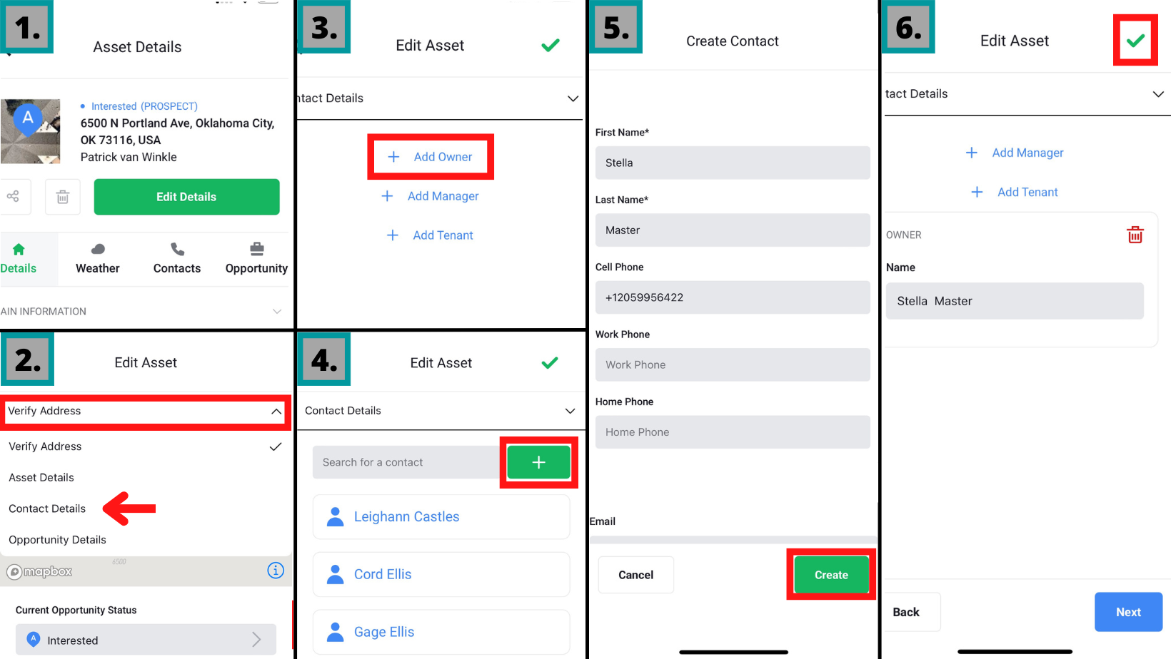 Mobile App First step: Find an Asset you want to edit Tap Edit Details Select Contact Details from the drop-down and tap the contact you want to add (Owner, Manager, or Tenant) Select from your current list of contacts OR tap the green ➕ to create a ...
