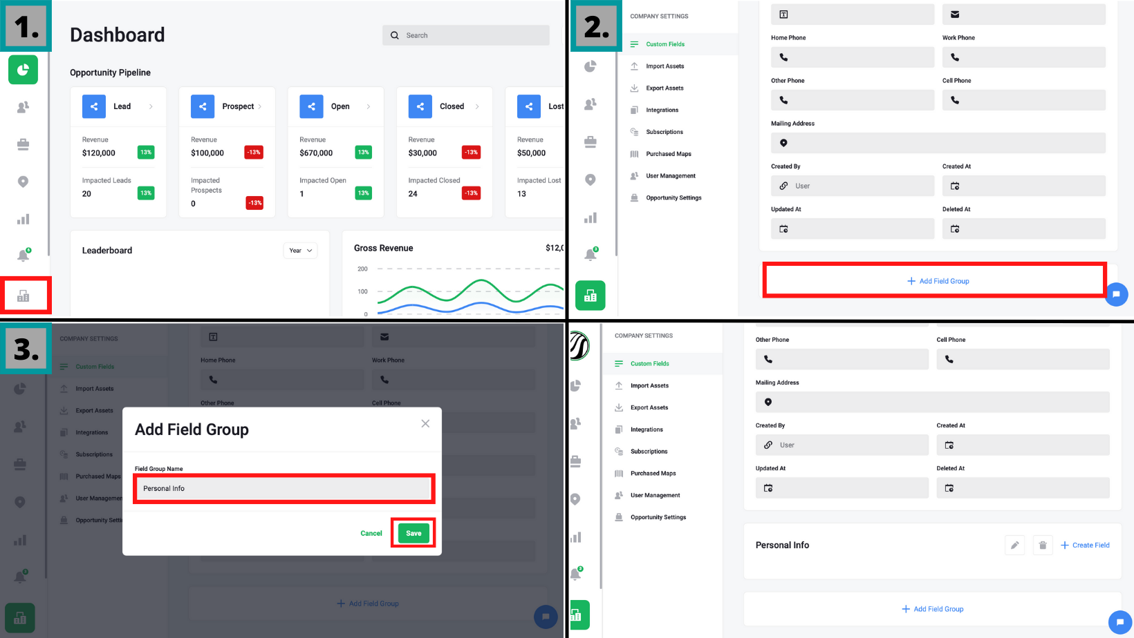 For example, a User may want to collect information for a Contact's position at a company or birthday. A User would create Field Group "Personal Info" and two Fields"Position" and "Birthday"underneath it.