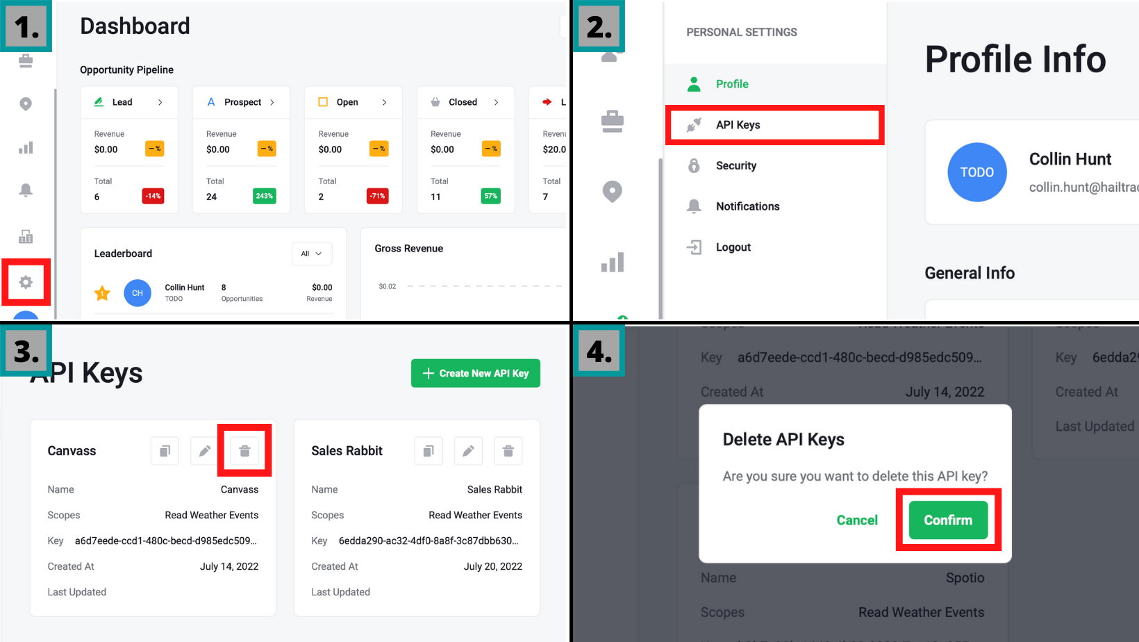 In the JobNimbus app, click the User Icon on the top right Click Settings Select API along the left-hand bar Click New API Key Create API Key Under description, select HailTrace Under access Profile, select Admin Click Save Copy API Keys Next: Set Up ...