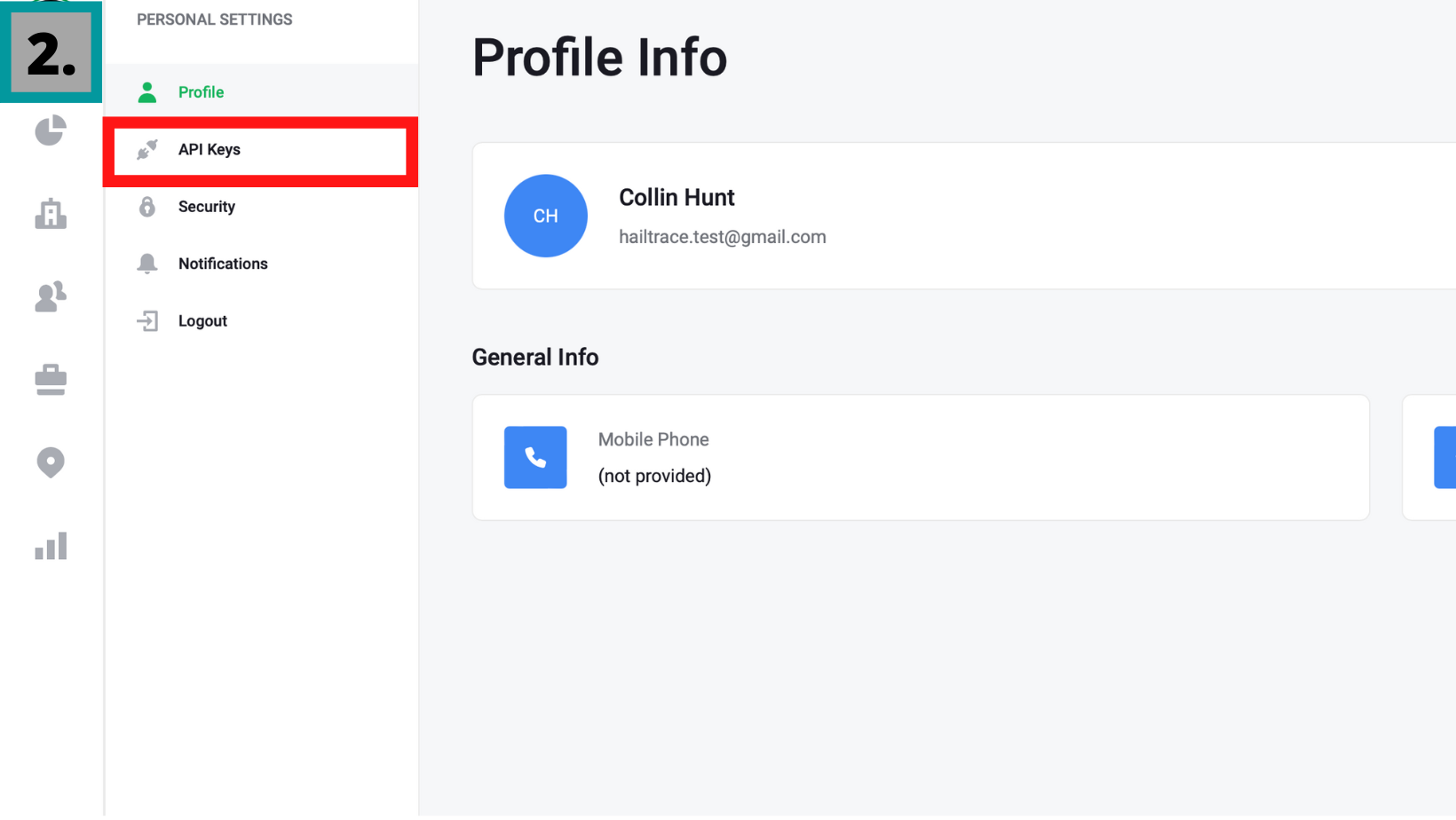 Browser App Along the left-hand bar, select Personal Settings, indicated by the "gear" icon Select API Keys Tap Copy to the right of the API Key "title" Paste the copied API Key into your application to integrate HailTrace maps