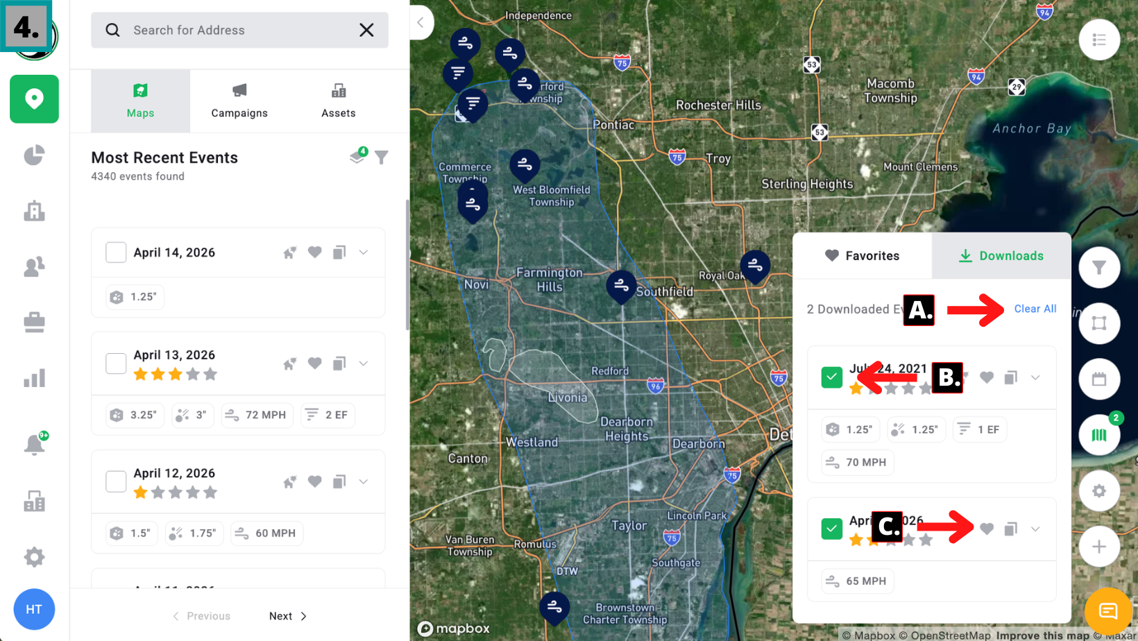 Mobile App Along the bottom bar, select Maps tab, indicated with a "location icon" Tap the Map Icon on the right-hand bar Tap Active From the list you can: Remove Individual Download Weather Events Add Weather Events to Favorites Clear All Downloaded ...