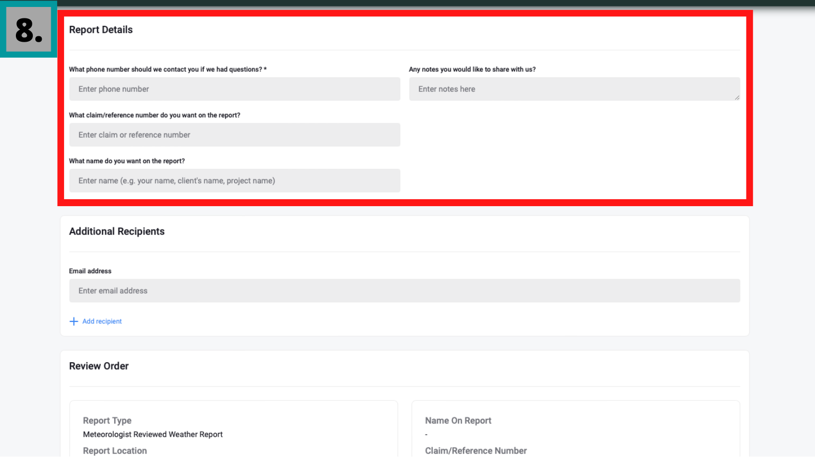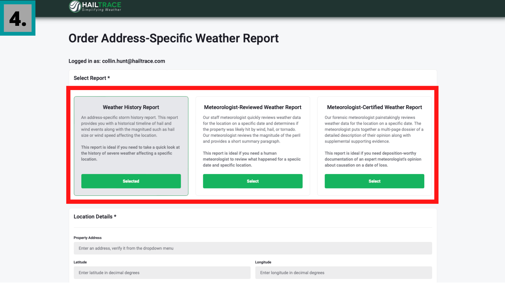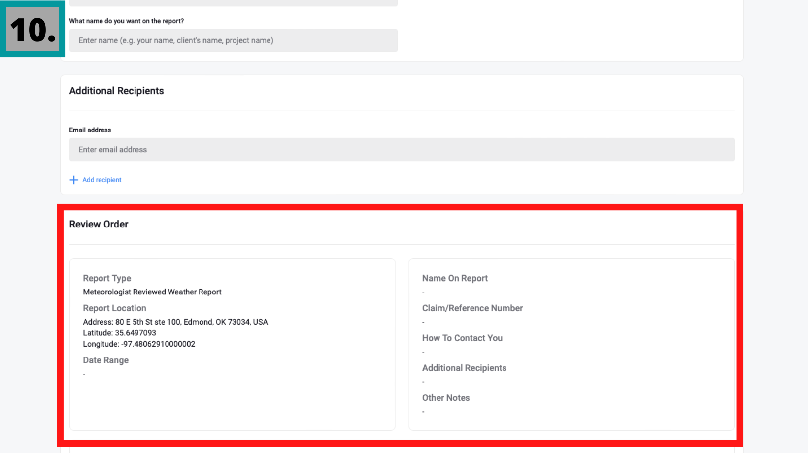 6. Under "Select Date Range," select a date range for the report:Weather History Report: Choose the date range of storms to show up on the history report. You can select a custom range, 1-year, 2-year, 3-year, or Full History.*Meteorologist Reviewed Report: Choose a specific date or range, and our Meteorologist will review it by starting with the most recent date and working backward to find a valid storm.*If there is no storm at the address for the selected date range, you will receive an error message when you order the report.7. (Meteorologist Reviewed Report Only) Under "Select Peril," pick the storm type you want on the report, such as hail, wind, or tornado.8. Under "Report Details," include any details for the report, such as claim number, name on the report, or a note to our Meteorologist(Reviewed Report Only).9. (Optional) Under "Additional Recipients," add any additional people you would like to receive this weather report *you do not need to input your email10. Under "Review Order," verify the report details are correct before proceeding.11. (Free Accounts Only*) Under "Select Payment," add a new payment or select a saved payment method.*If the address is in your HailTrace Maps subscription area, the Weather History or Meteorologist Reviewed Report will be free.12. Select Buy Now and find the Weather Report in your email!Note: Meteorologist Reviewed Reports take between 5-10 business days, depending on order volume.