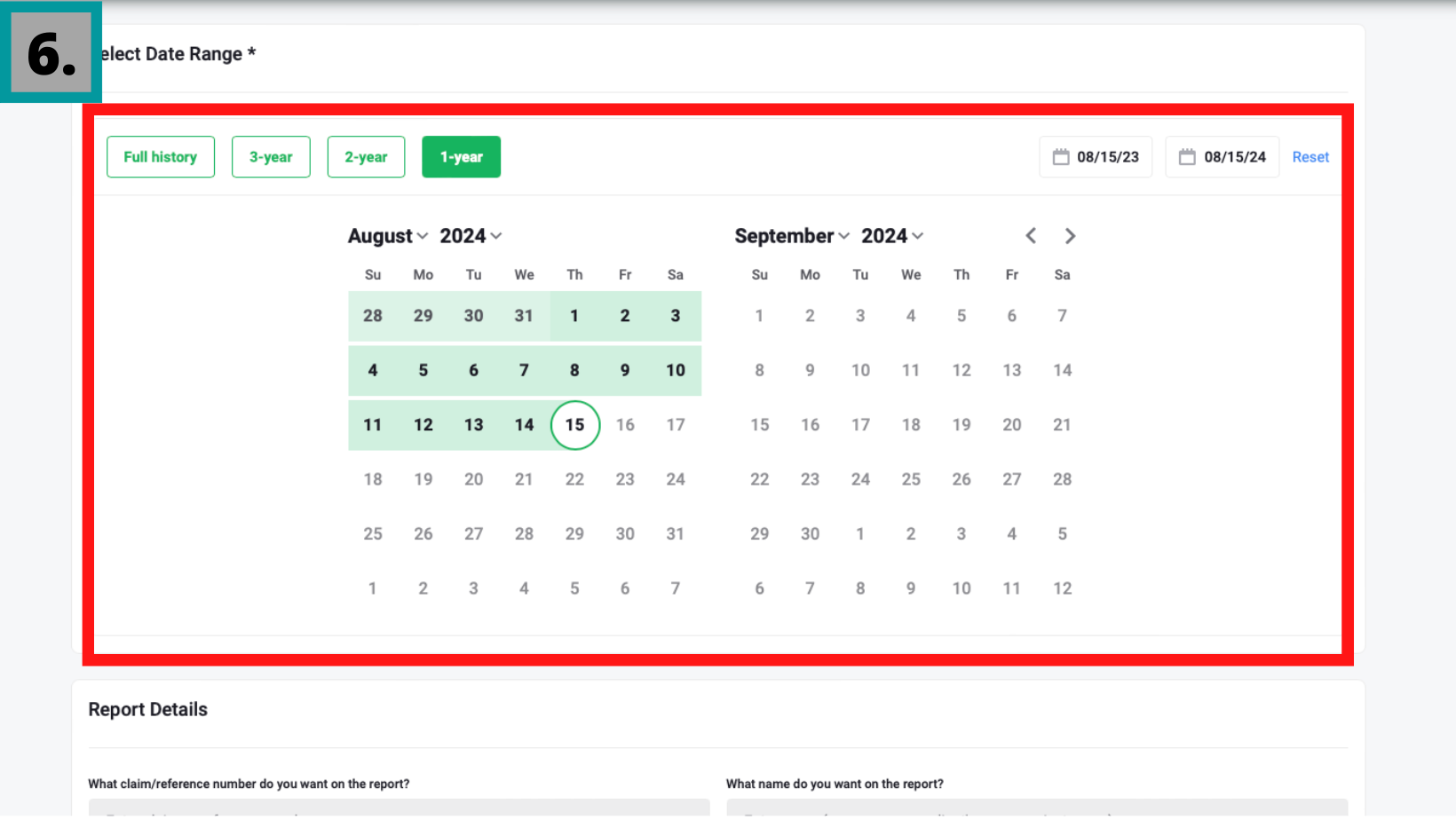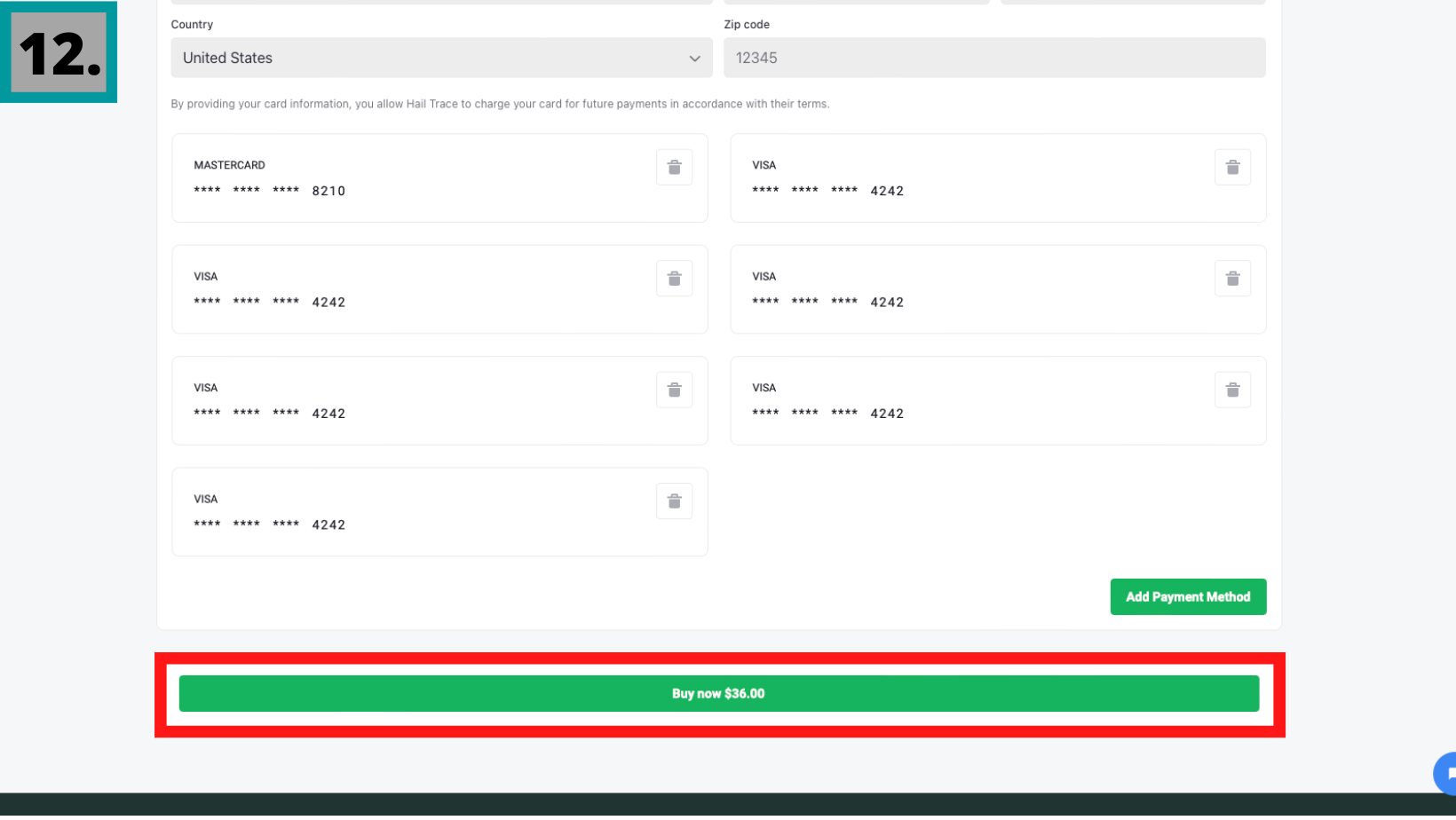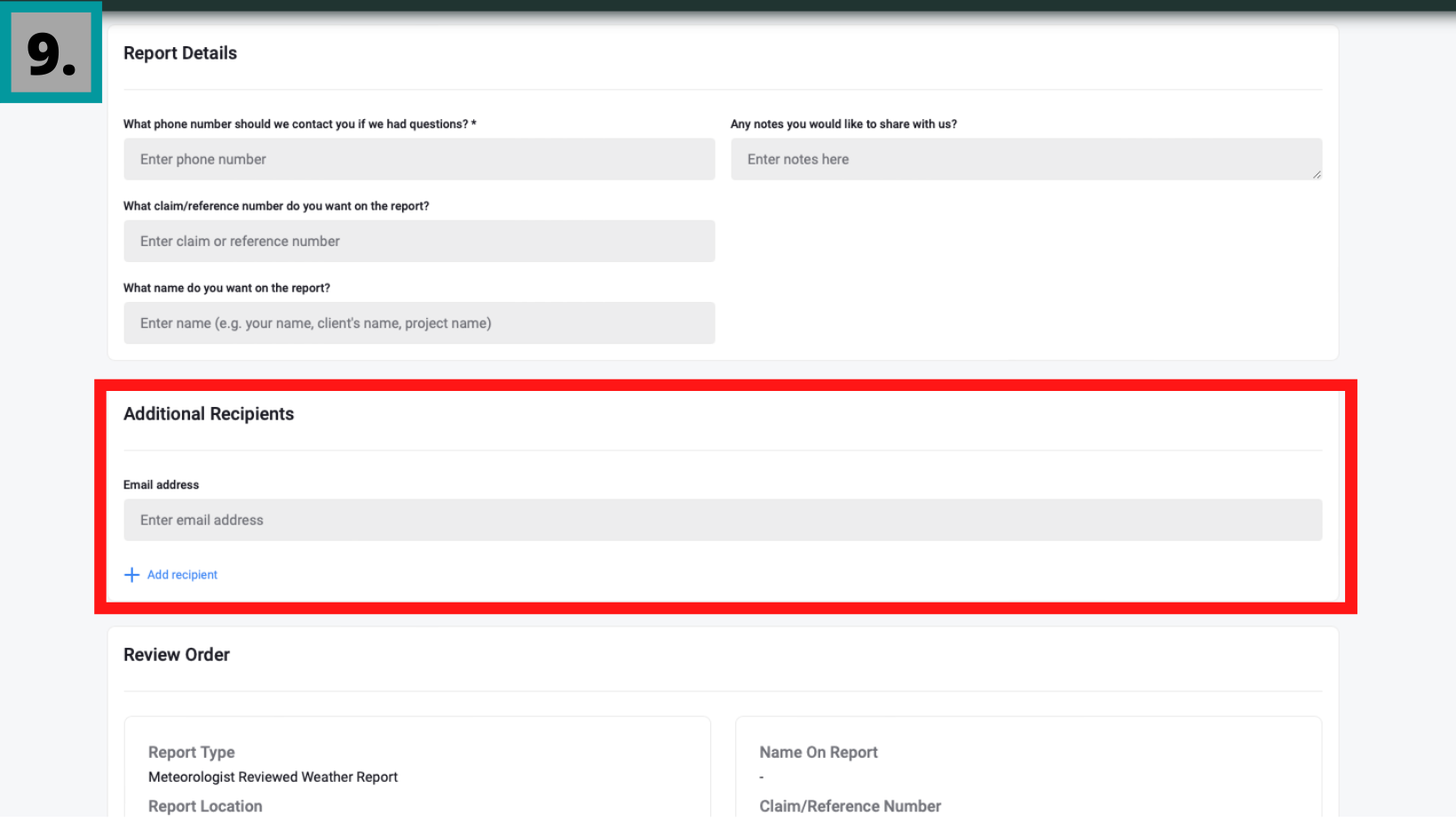 6. Under "Select Date Range," select a date range for the report:Weather History Report: Choose the date range of storms to show up on the history report. You can select a custom range, 1-year, 2-year, 3-year, or Full History.*Meteorologist Reviewed Report: Choose a specific date or range, and our Meteorologist will review it by starting with the most recent date and working backward to find a valid storm.*If there is no storm at the address for the selected date range, you will receive an error message when you order the report.7. (Meteorologist Reviewed Report Only) Under "Select Peril," pick the storm type you want on the report, such as hail, wind, or tornado.8. Under "Report Details," include any details for the report, such as claim number, name on the report, or a note to our Meteorologist(Reviewed Report Only).9. (Optional) Under "Additional Recipients," add any additional people you would like to receive this weather report *you do not need to input your email10. Under "Review Order," verify the report details are correct before proceeding.11. (Free Accounts Only*) Under "Select Payment," add a new payment or select a saved payment method.*If the address is in your HailTrace Maps subscription area, the Weather History or Meteorologist Reviewed Report will be free.12. Select Buy Now and find the Weather Report in your email!Note: Meteorologist Reviewed Reports take between 5-10 business days, depending on order volume.