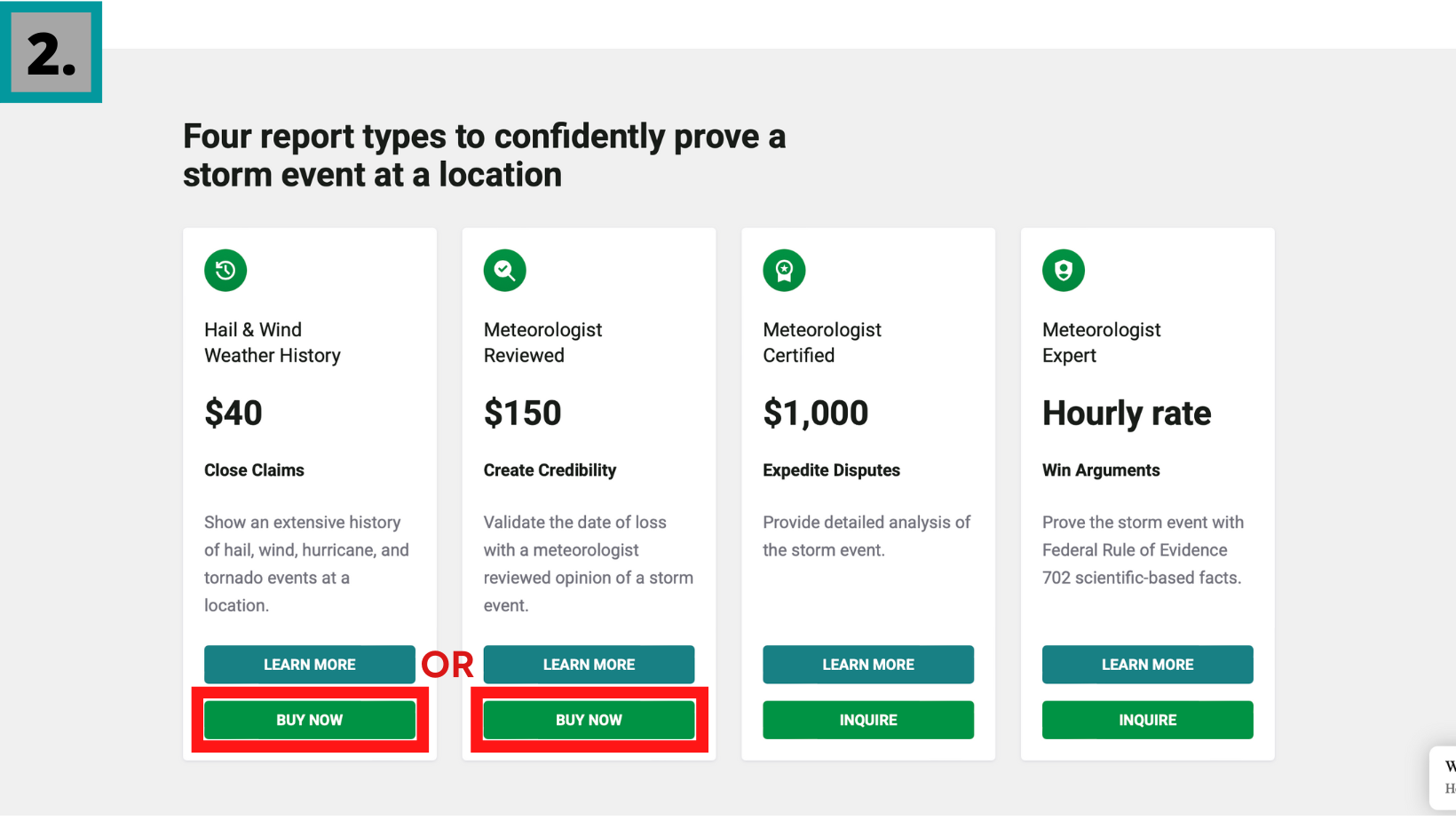 2. Under "Four Report Types," select Buy Now for the Weather History or Meteorologist Reviewed Report.