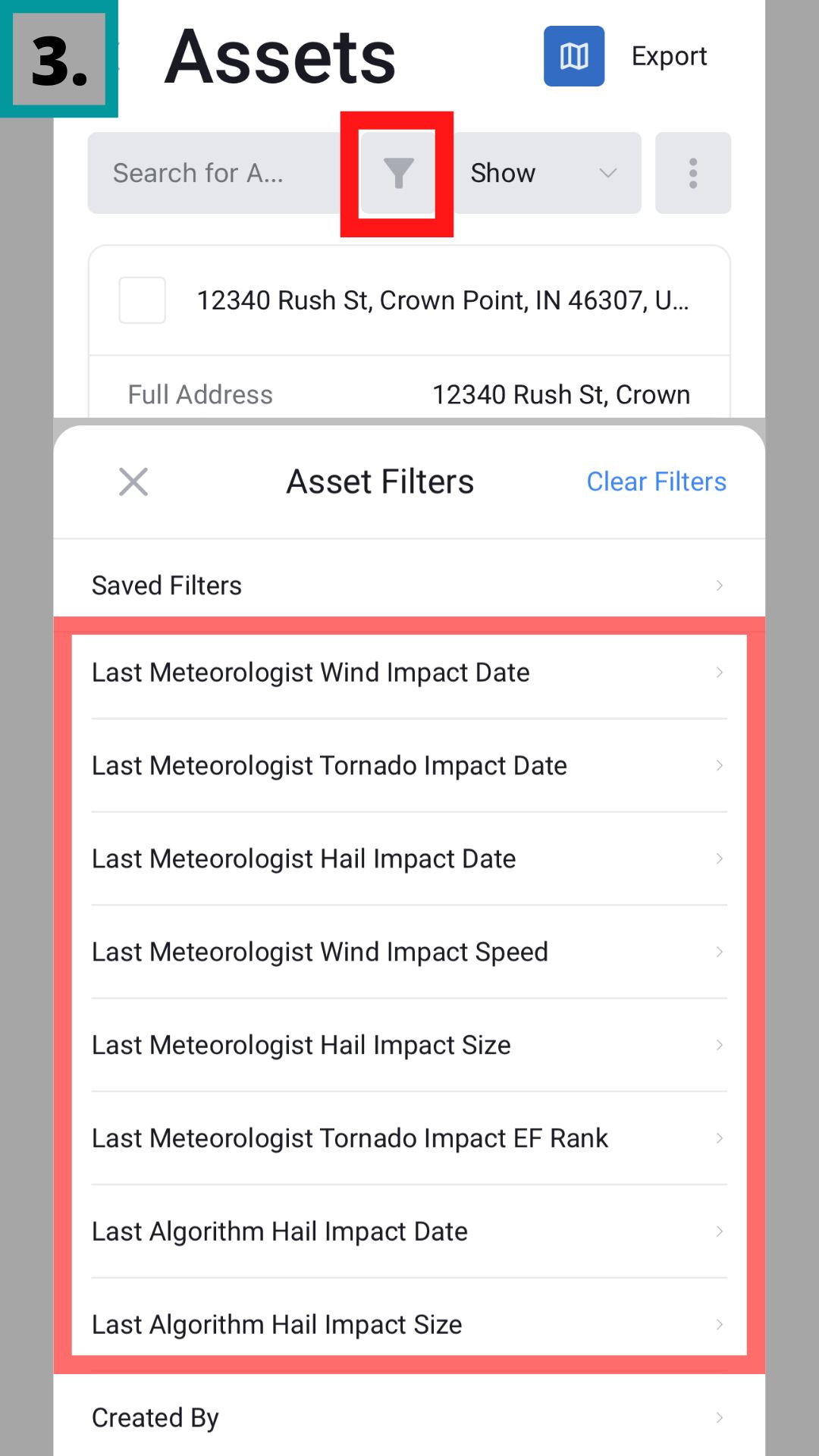 Activos Afectados por Filtros: Utiliza este método para encontrar activos impactados por eventos específicos de granizo, viento o tornados dentro de un rango de fechas seleccionado. Puedes combinar estos filtros con otros filtros de activos para obtener resultados más precisos.